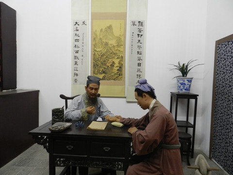 纪念展厅的第二部分是“济世救人 医术高超”。还原玄妙观李时珍诊所的场景,使观众体验到古代中医药店的氛围以及了解中医工具的使用。李时珍从23岁开始,彻底放弃了读书考功名的想法,子承父业,悬壶济世,正式走上了医学之路。李时珍非常重视本草,并富有实践精神,肯于向劳动人民群众学习,果然成了当地一名很有名望的医生。明世宗嘉靖三十年(1551年),李时珍33岁时,因治好了富顺王朱厚焜儿子的病而医名大显,荆王将他介绍到武昌的楚王朱英裣聘为王府的“奉祠正”,兼管良医所事务。明嘉靖三十五年(1556年)李时珍又被推荐到太医院工作,授“太医院判”职务,后又被推荐上京任太医院判。太医院是专为宫廷服务的医疗机构,当时被一些庸医弄得乌烟瘴气。李时珍再此只任职了一年,淡泊功名利禄,于明世宗嘉靖三十七年(1558年)从太医院辞职回乡,以自己的字“东璧”为堂号,创立了东璧堂,坐堂行医,致力于对药物的考察研究,时人谓之东璧国医堂。