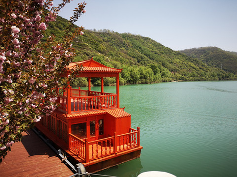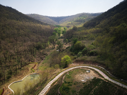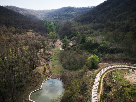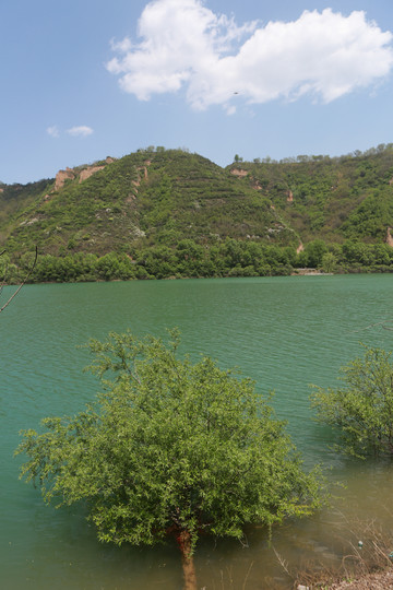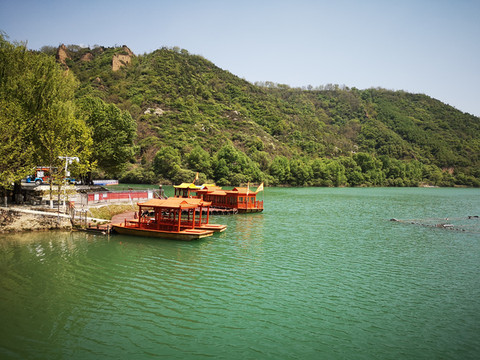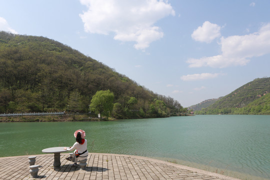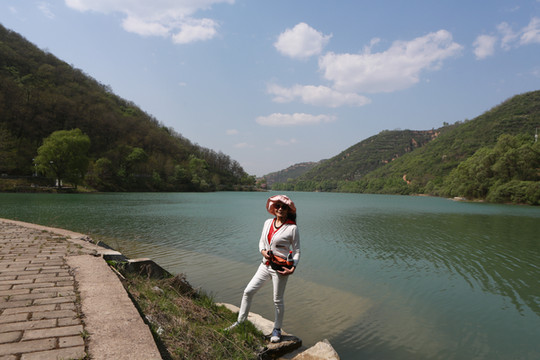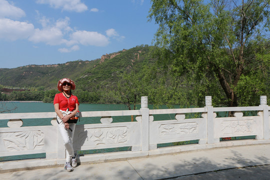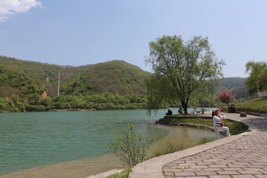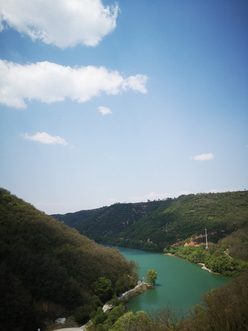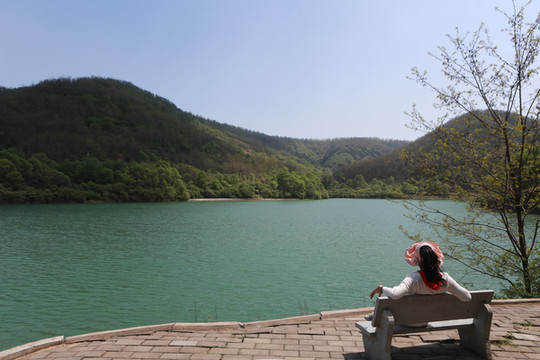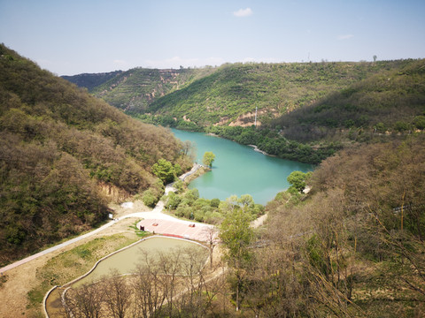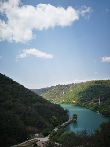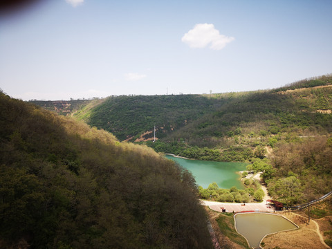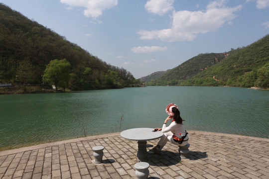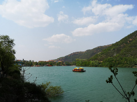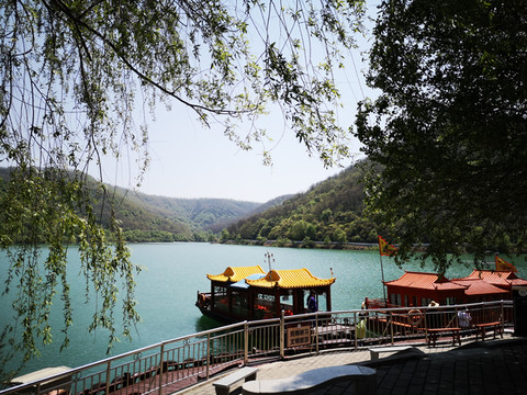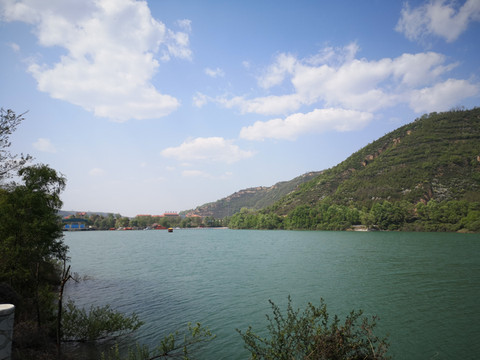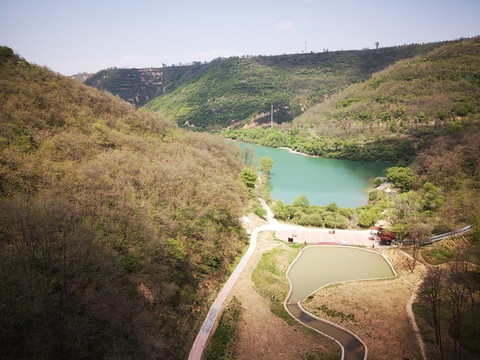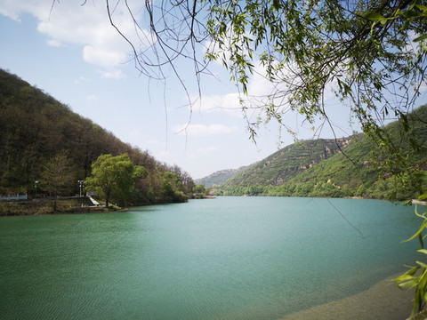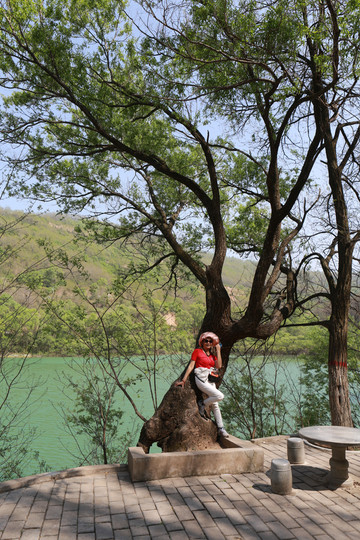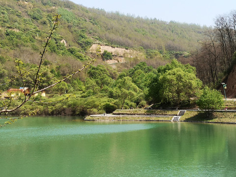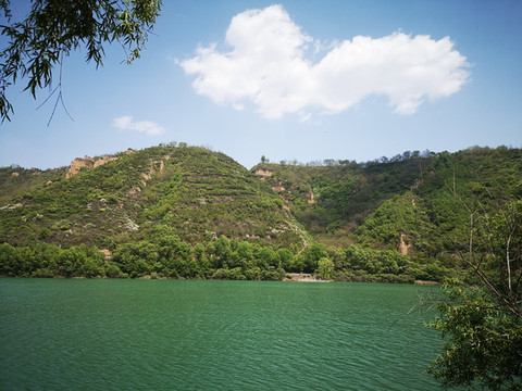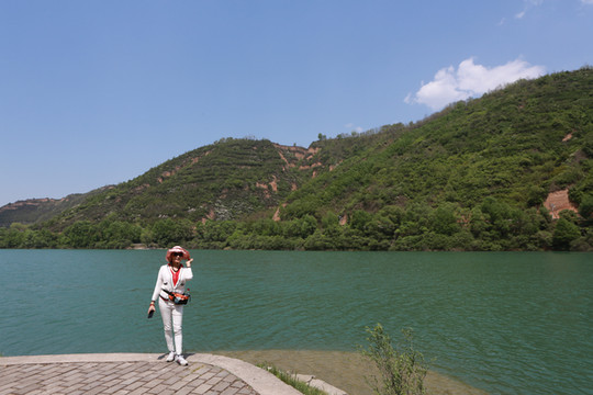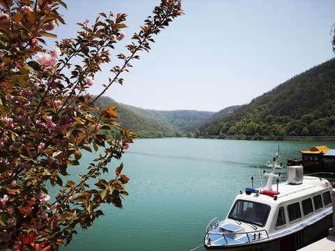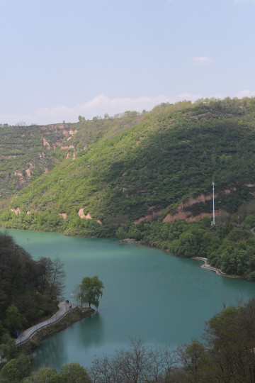 停车场没有几辆车,游客寥寥无几,心里不由产生一种莫名的感觉“不会令人大失所望吧”?坐上摆渡车沿着山路一路下行,路边茂密的树林和盛开的牡丹和芍药以及忽隐忽现的一汪绿水,慢慢舒缓了我疑惑的心情。十几分钟后到达山谷谷底,步入景区,眼前一亮,满目的景色冲击着我们的眼球。哇!太美了!太干净了!太安静了!名副其实的世外桃源。情不自禁的惊叹渭北黄土塬深处竟然隐藏着如此清净的一汪绿水!