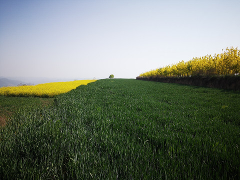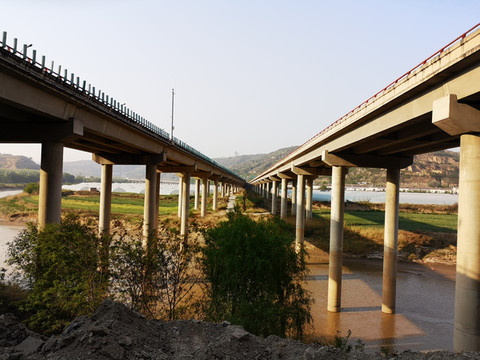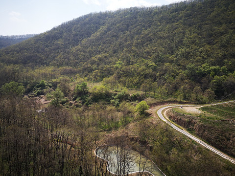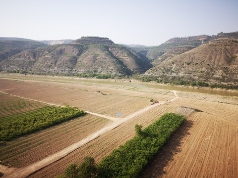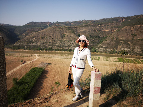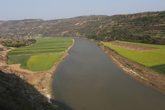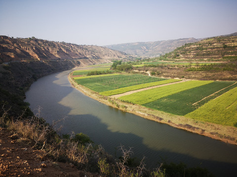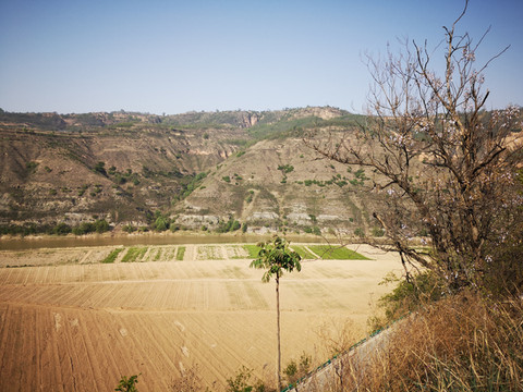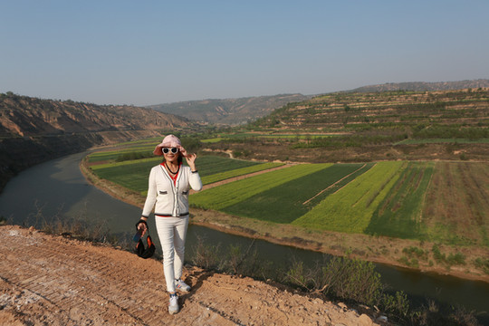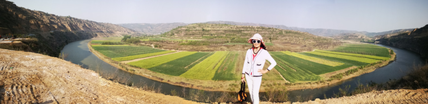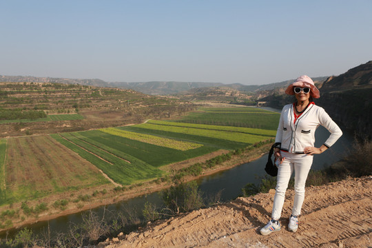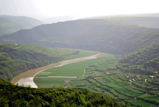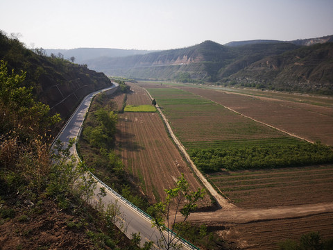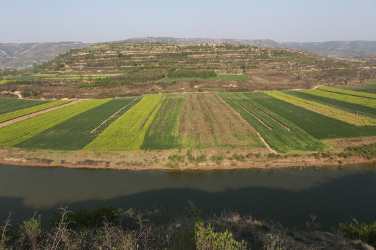 我想高处必有一个最佳观景点。经过寻访,老乡指向“姚联村”,我们找到“姚联村”,仍然没有“太极图”,但景色很让人意外。来到泾河岸边,那里有两处施工工地(据说要建水电站),站在铺平的工地,对面恰好是枣渠滩,它在太极湾之东。举目望去,塬上层层梯田,河滩麦苗嫩绿,田地整齐划一,清清的泾河河水精准的画出一个半圆,多重线条组合成美妙的几何图形,景观独特,宛若一幅立体画卷。