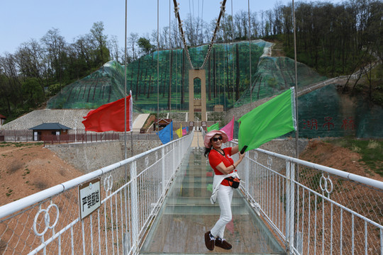 站在玻璃吊桥上,右望五彩缤纷的爱情花谷映入眼帘,左瞰波光粼粼的湖面尽收眼底。