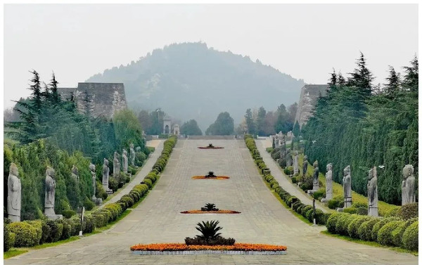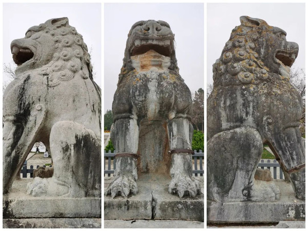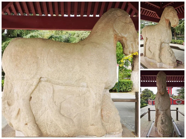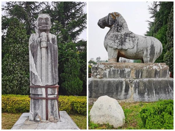 下图为石翁仲和翼马。石翁仲又称“拄剑石人像”或“直阁将军”,秦始皇曾遣阮翁仲镇守临洮,以御匈奴,后铸其铜像置咸阳宫门外,后世就把置于陵墓神道两侧的文武官员石像称为“石翁仲”;翼马又称“天马”或“飞龙马”,为古代传说中的一种瑞兽,立于陵墓前表示墓主人为圣德之君。