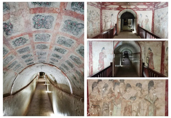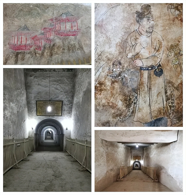 永泰公主墓包括墓道、甬道和墓室,全长87.5米,共有六个天井、八个便房,内摆满陶俑、唐三彩等随葬品,虽然曾经被盗,出土文物仍然多样。三彩俑造型精致、色彩鲜艳、文饰奇特,反映了唐代高度发展的陶瓷工艺水平。墓内壁画丰富多彩,不失为唐代绘画的精品。