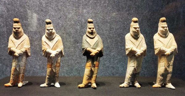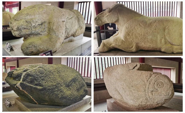 (茂陵博物馆展出的精品文物:错金银铜犀尊、四神纹玉雕铺首、鎏金铜马、陶制动物,前三件都是国宝)