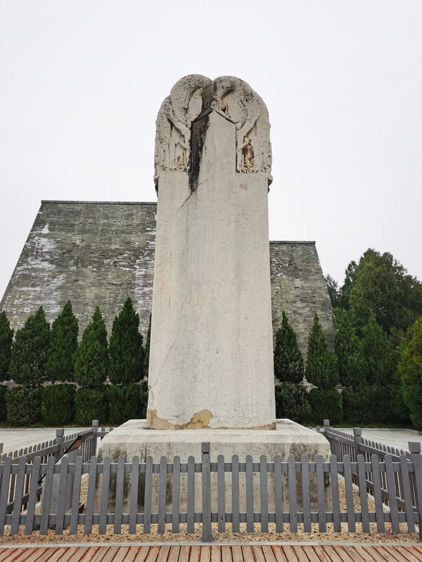 下图为述圣纪碑,刻有武则天撰写的、为唐高宗李治歌功颂德的《述圣纪》,铭文由中宗李显书丹,字间填以金属,光照陵园。