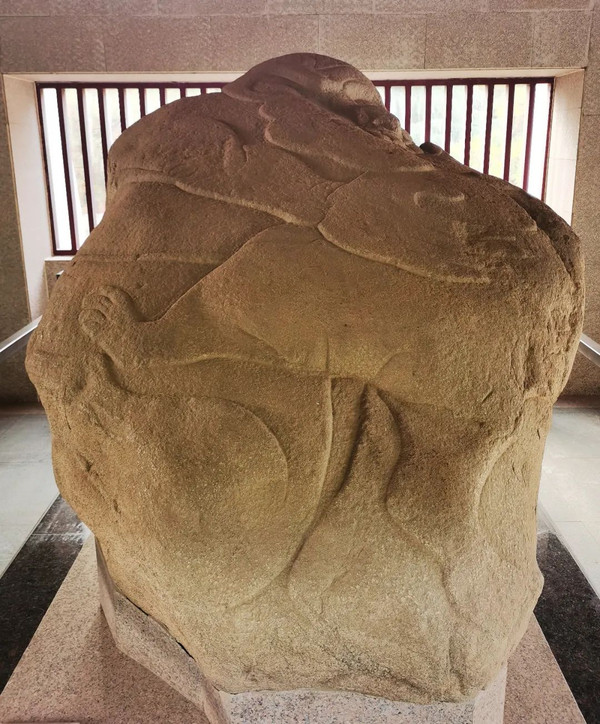 下图为马踏匈奴,与之前介绍的西安碑林的大夏石马有点像,因为大夏继承了秦汉的石雕艺术风格。此为霍去病墓石刻群中的主体雕刻,马的形象坚实有力,姿态威猛,气宇轩昂。马腹下的匈奴人仰卧地上,左手握弓,右手持箭,双腿蜷曲,作狼狈挣扎状,蓬松凌乱的须发更显得惊慌失措、声嘶力竭。其手法简练概括,于浑厚中显示出雄强的力之美。
