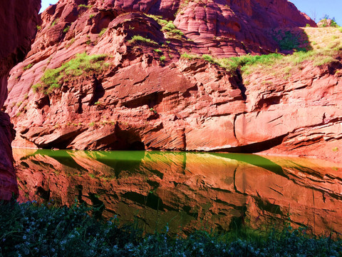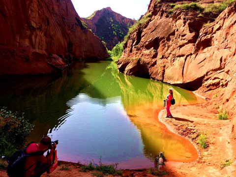 这是是典型的盆地型峡谷,这里红岩环绕,绿水萦绕,方圆百公里都被其一的红色砂岩所覆盖,与 美国 亚利桑那州 的波浪谷非常相似, 亚利桑那州 波浪谷红色之间夹有白色线条, 靖边 波浪谷则以红色为主。