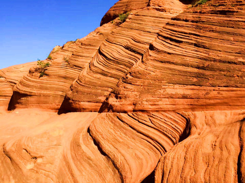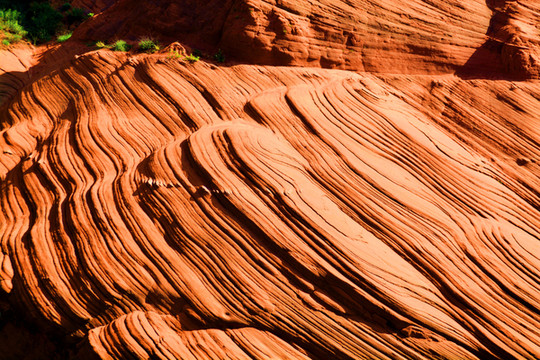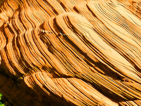 波浪谷岩石的层面非常复杂,由侏罗纪时期沉积下来的沙丘组成。这些沙丘也不断被水中的红沙覆盖,时间一久,水中的矿物质就会将这些砂岩给钙化,之后便形成巨大的沙丘,经过风化等过程后,从而实现如今的这般美景。不过这些砂岩被风化脱离的非常的严重,在上面行走的时候一定特别的小心。