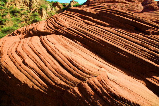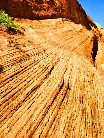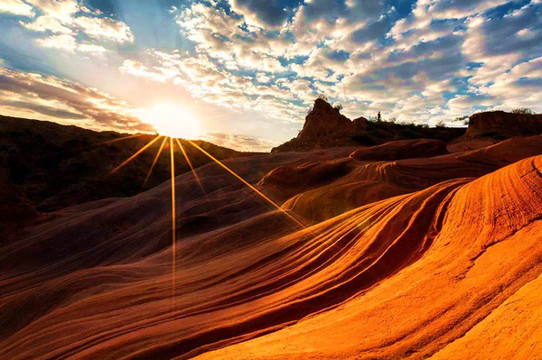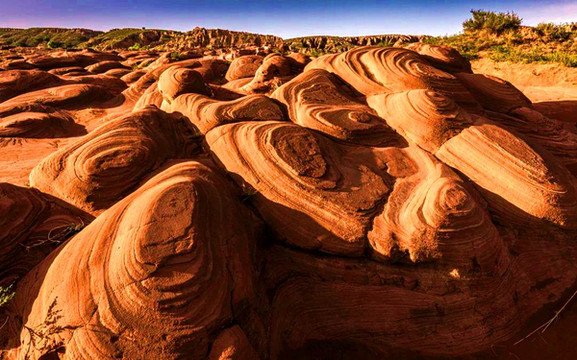 波浪谷岩石叫红砂岩,学术上被称为“砒砂岩”,地质学称之为丹霞地貌,其得名是由于砂岩纹路像波浪一样。龙洲的红砂岩大都被厚重的黄土所覆盖,经过 陕北 黄土高原数千万年的大风吹袭和季节性暴雨强有力的冲刷,红色山块逐渐显露出来,并被大自然的鬼斧神工“雕琢”成各种各样的形状。