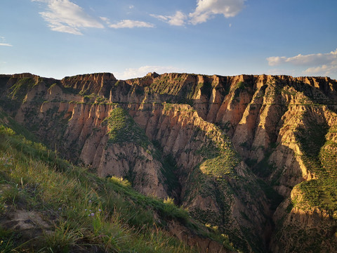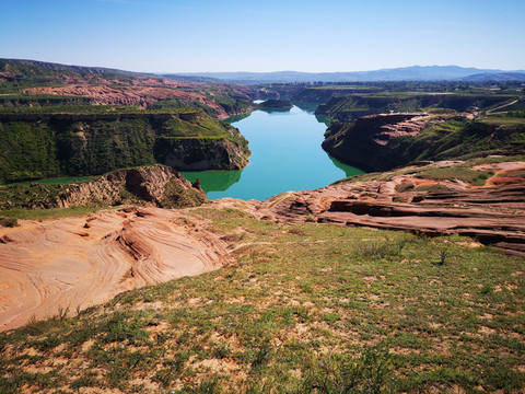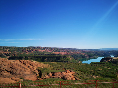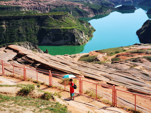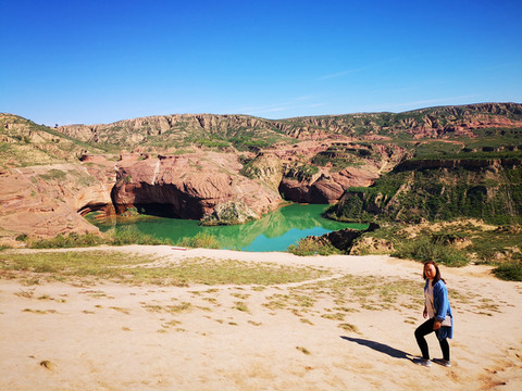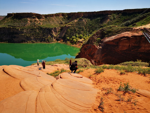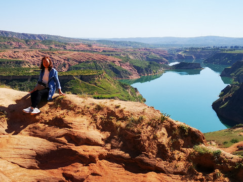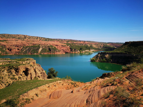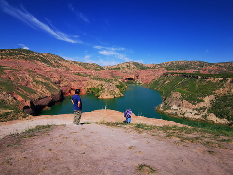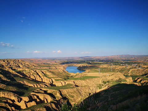 登高望远,黄土高原的蓝天送来心旷神怡的美,翠绿的湖水亚赛翡翠,远方的丹霞地貌高低起伏错落有致,美不胜收。