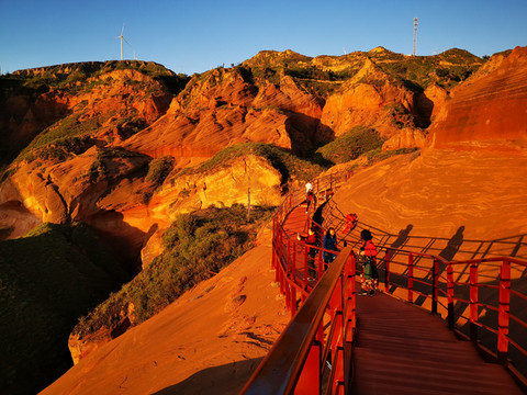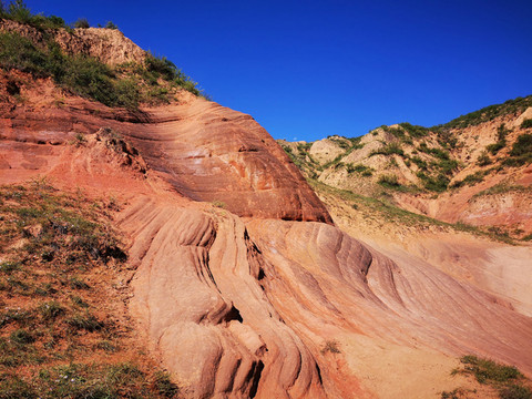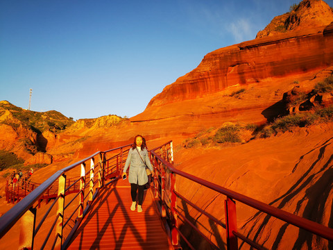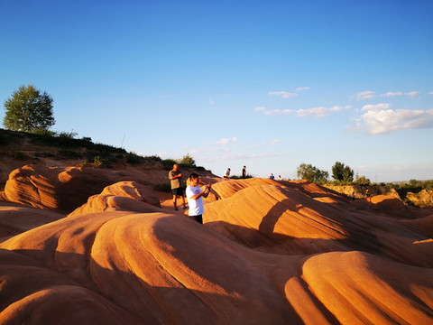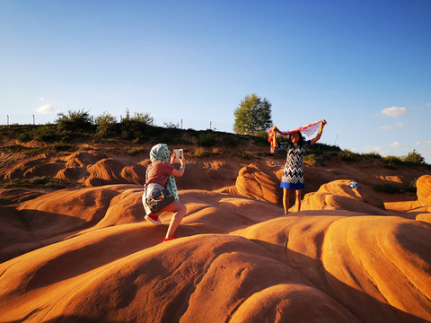 话说当年女娲娘娘造人,有俊俏的有丑陋的,特别是为了那俊俏的帅哥倩女颇下了一番功夫,用了五彩斑斓各种颜料来画描,这一日任务完成,娘娘洗洗手,打扫了周边的卫生,连同剩下的丹砂颜料,倒出门外。这一下不当紧,一盆水到了靖边县龙洲镇闫家寨子地界,才有了这壮观神奇的丹霞地貌。亿万年过去了,2012年几名地质摄影家为了拍摄黄土高原的地貌来到这里,从此靖边波浪谷丹霞地貌神秘的面纱被揭开。