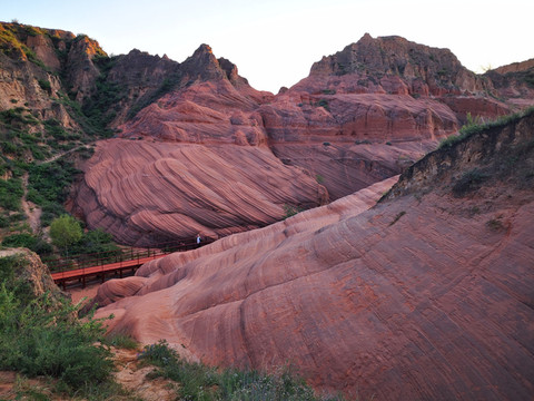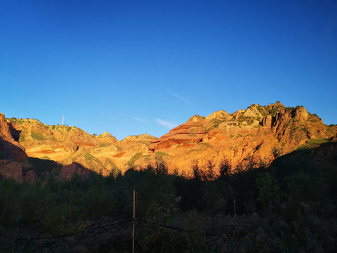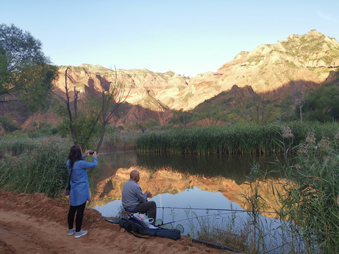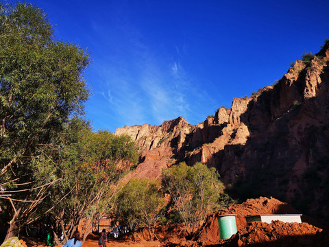 沟壑峭壁伴碧水,朱砂细流染山川。