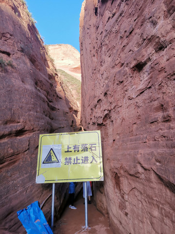 7点12分来到一线天,一线天前有“上有落石禁止入内”的牌子,但是在景区施工人员开始进入景区之前导游还是会带领游客进入。