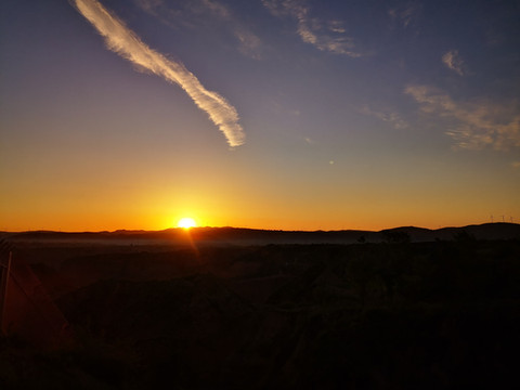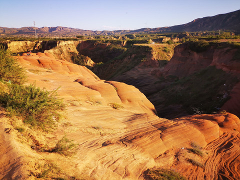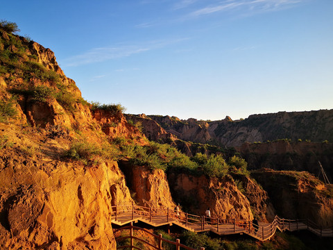 夕阳下远处的沟壑显得阴森森的,给人一种晕眩的恐怖,夕阳下的沙丘又给人流畅的美感,落日余晖照在上面金黄色的砂岩形成了一道道靓丽的景色。