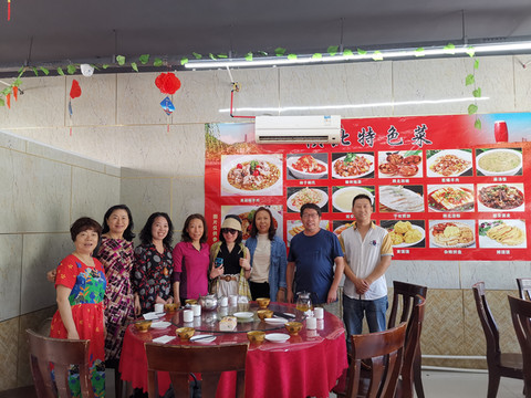 13点半我们到了延安,小张带我们到了枣园路一家有陕北特色的“陕北农家饭炖羊肉”饭馆吃饭,虽然大家来自五湖四海口味各异,但是对品尝一下延安特色的美食还是比较一致的。我们点了凉拌甘泉豆腐干(绿豆制作、口味独特)、柿子碗托(荞面制作)、陕北四碗(以前百姓家的年夜饭,属于硬菜,有丸子、扣肉、酥肉、排骨)、小炒肉、杂粮拼盘(有黄馍馍、油馍馍、摊馍馍、油糕,这在以前也是陕北美食)、鸡蛋炒地皮菜、炖土鸡等。