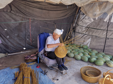 在景区入口的地方看到一位手工编织柳条工艺品的老大爷,手里不停的编织,嘴里不停的唱着民歌,惹得小美女团友又是拍照又是录像。