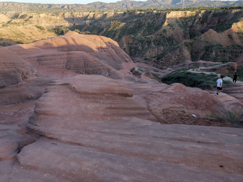 我们在下午5点半来到波浪谷摄影基地(即B区)。进入景区就被黄土高原上的美景深深吸引,且不表万丈沟壑的壮观,单说流水壮的泥石向着沟壑深处流去,一堆堆、一团团、一块块、一坨坨、一圈圈的,形态千奇百怪,好像层层波浪此起彼伏,令人目不暇接。很多砂砾岩还没有形成岩石,走在上面泛起细细的沙子,一不留神就会被滑倒,我也曾三次被滑倒,只得小心翼翼慢慢行走。