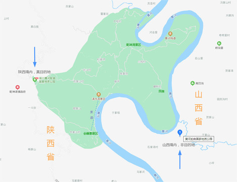 在山西境内,也可能在公路旁看到一个巨大的标牌指示有“黄河蛇曲国家地质公园”,诱惑着涉世未深的游客。但真正的黄河蛇曲公园在陕西境内,又称乾坤湾(广义的乾坤湾)。