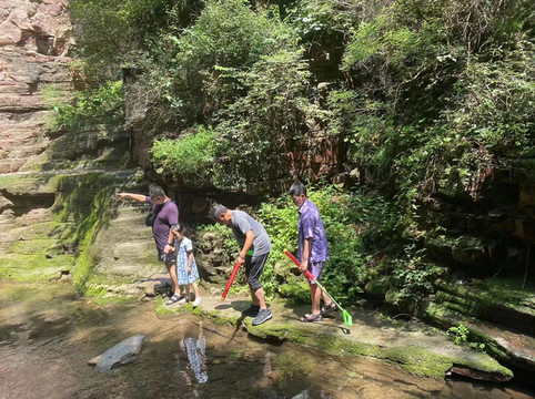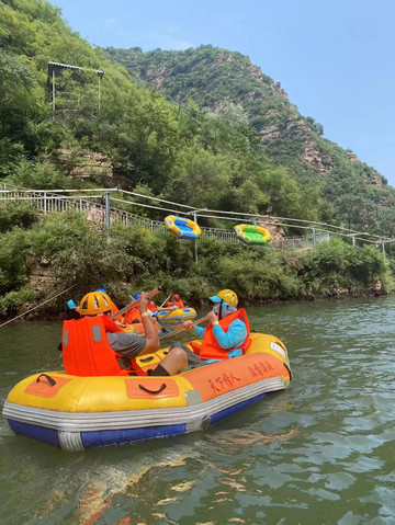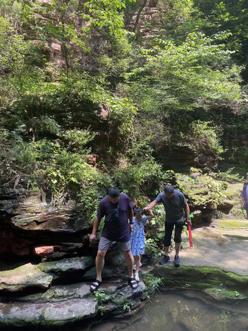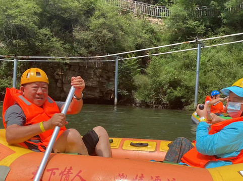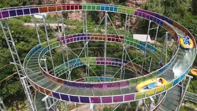 进景区后有电瓶车可以做,20往返,送到上山入口,选择水路上山,一路全是溪水瀑布,孩子们可以下水嬉戏,玩儿的不亦乐乎,沿水路不行到山顶后,可以选择溜索或者高山滑梯到达第一段漂流,玻璃栈道漂流,左拐右拐的,挺有意思。
