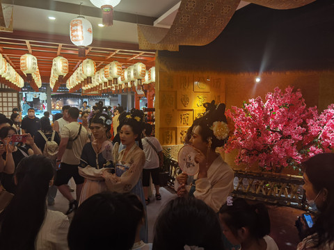 街区里人山人海,各种汉服装扮,看着妆容精致像那么回事儿的就是街区里的NPC,其他五花八门的就是游客居多,街区里各种商铺,还有几场演出,排队几十米,我是没心情凑这个热闹,逛了逛就找地方歇着去了,我们家好事儿宝宝带着两个娃挤进去看了2场演出,评论也不高。整体装修风格还是在线的,就是人太多了,如果人少点,应该很适合拍照。街区里有租汉服的,化妆的,跟拍的,价格百十块到几百不等。