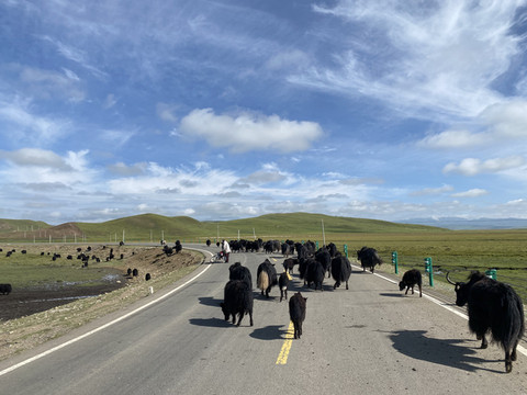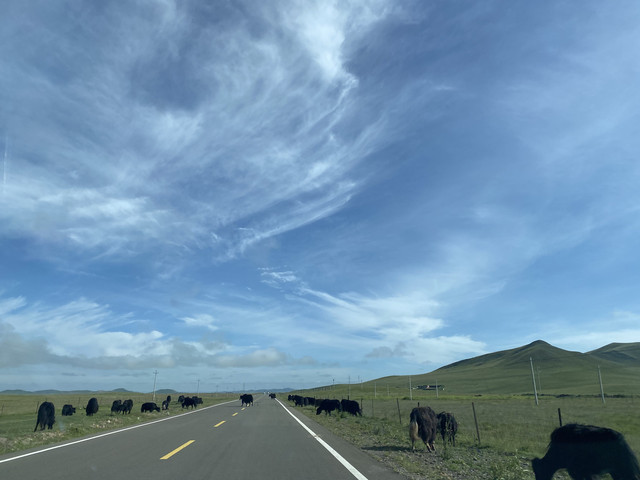 黄龙景区出来,驱车直奔若尔盖大草原,曲折蜿蜒的盘山路一下就过渡到了蓝天白云的大草原,漫山遍野的牛羊马以及满地的牛羊马粪,让人心胸豁然开朗。