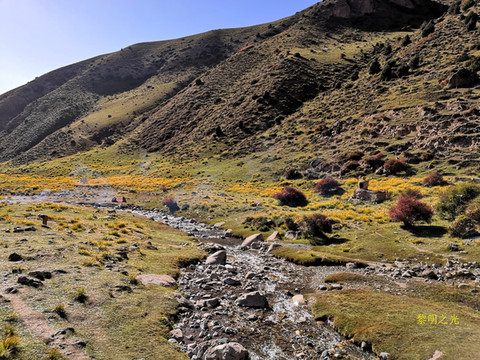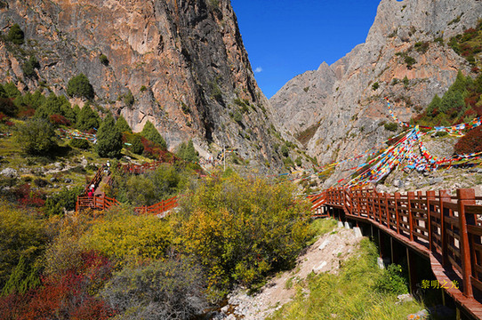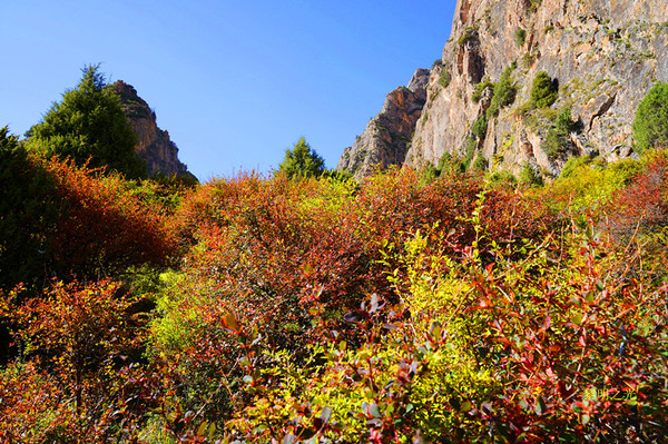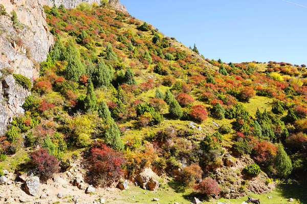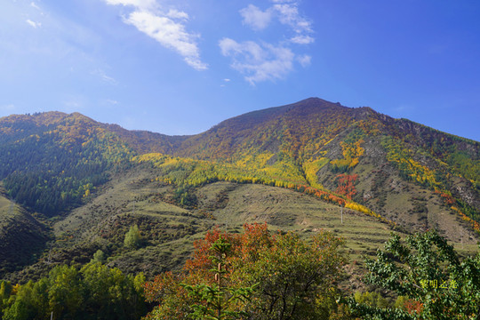 我们的目的是自由逛、散散心、欣赏风景,无需赶时间,所以没有上高速,而是沿兰磨线前行。经过土门关,汽车开始在山谷中蜿蜒行进,这里群山叠嶂,一会儿翠绿的青山夹杂着红色、黄色的树叶,似一幅幅大型油画,一会儿土灰的山峰点缀着褐色的印记,恰似一幅缓缓展开的水墨画;一会儿视野突然开阔,青山绿水,一会儿群山遮挡,好似无路可行;一会儿出现在眼前的是建筑新颖的藏寨,一会儿又见半山腰中时隐时现的佛教寺院;眼前绝妙的风景,湛蓝的天空映衬着朵朵白云,加上我们放飞的心情,感觉无比兴奋,一路走走停停,说说笑笑,拍照留影。