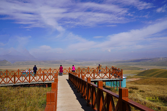 当我们停车拍照时,跟随在后面的好多车辆都停下来,游人们经不住美景的诱惑,都拿出手机拍风景。看来大家对美的追求都是一样的。我们的车很快驶过麻当镇,在王格尔塘分路后,经过夏河县城,10:50我们到达了诺日郎卡观景台。这里有停车场、卫生间,还有当地小伙们搭起的简易帐篷,售卖当地的土特产。有栈道、观景台等设施。我们一行六人看见草原兴奋无比,沿木栈道走上最高处,顿时,视野一下子开阔了!哇塞!太美了!这金黄色的甘加草原和绵延不绝的山峰,深深地吸引了我们的眼球,感觉我们尘封的心灵一下子被打开了!极目远眺,只见四周山峦起伏,由近及远一层层扩展开来,整个草原美景尽收眼底,草原好似一块天然的彩色地毯,蜿蜒的公路、村镇、海子、如绣花一样点缀在地毯上,绵绵延延直到天际,最后隐藏在浓浓的云雾中若隐若现,充满了无限神秘感。景色广阔大气,层次分明,极其壮观。我们异常兴奋,拿出手机、相机齐上阵,三个人一张,五个人一“咔嚓”,这儿欣赏,那儿观看,尤其是几位女同胞,更是久久不愿离开,在多次呼喊后,才依依不舍的停止了拍照。