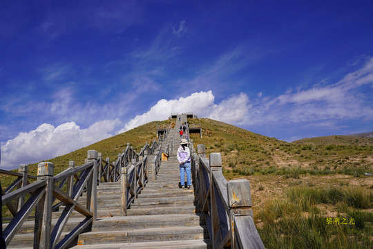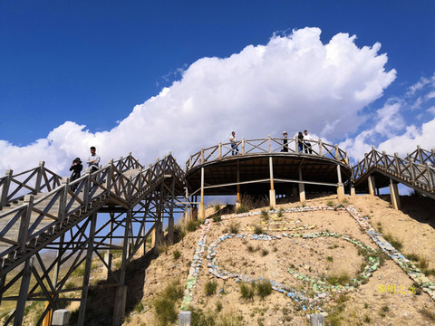 汽车又行驶了六七分钟到达八角城古遗址观景台,我们在停车场停好车后,就开始攀爬,这个观景台造型独特,大概有十几层楼高,从远处看十分壮观,攀爬台阶很费力,到达最高顶后,视野更加开阔。