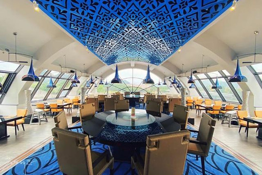 自助餐厅的主色调,是蓝色和红色,非常浓烈的色彩搭配。
