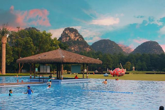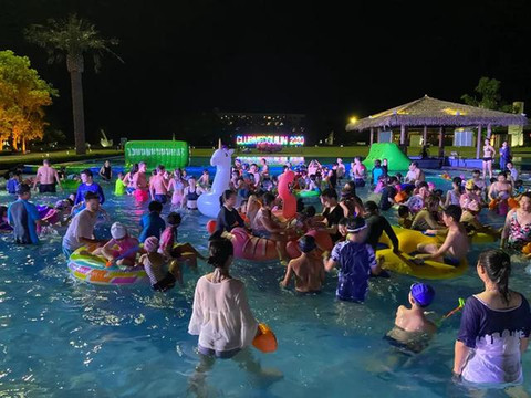 夕阳时分,是游泳池最热闹的时候。很多家庭在这里度假,享受着美好的亲子时光。