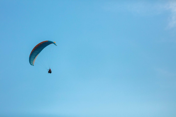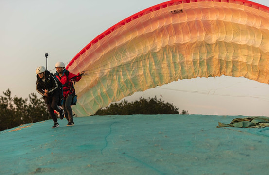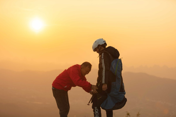 大概20分钟的车程,我们来到了山顶,此时夕 阳西 下,余晖满天。起飞前,同伴有些许的紧张,教练给穿上滑翔装备和护具,告诉他等会有风来的时候,一定要跑着飞出去。