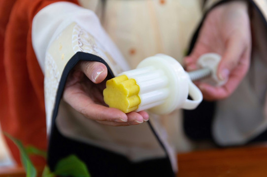 兔年来了,在这里还能亲自体验制作桂花饼。将桂花和面搓成团,然后放进不同形状的模具里,就能做出印有福字或者樱花形状的饼啦!