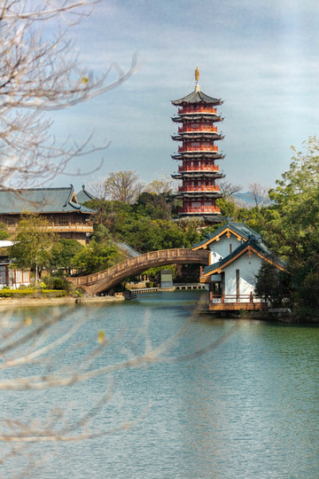 湖中的木龙塔是以 上海 宋代的龙华塔为蓝本建造的,在山水的环绕下,塔更为别致美观,围绕着湖走上一圈,无论从哪个角度欣赏,都有不同的景致。