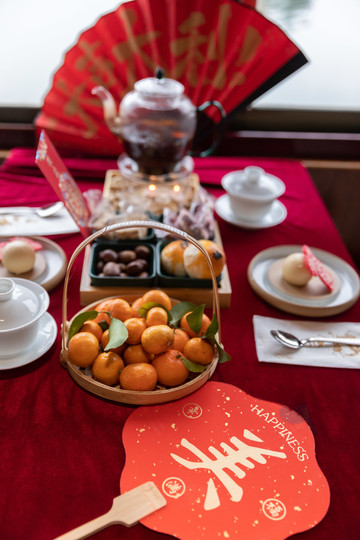 从日月湾码头上船,坐进有着浓浓年味的游船里,红红火火过新年的氛围一下子就有了。每个桌上的小食,水果都很丰富,还有红色的小纸扇,可以拿着拍照。