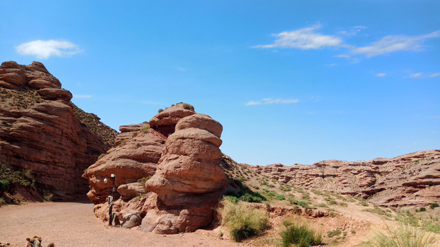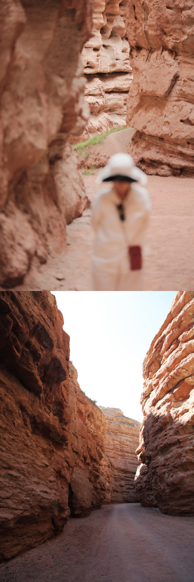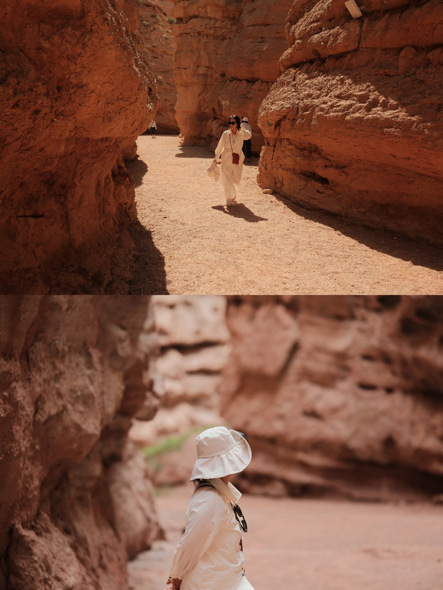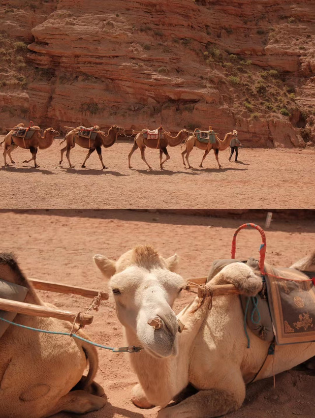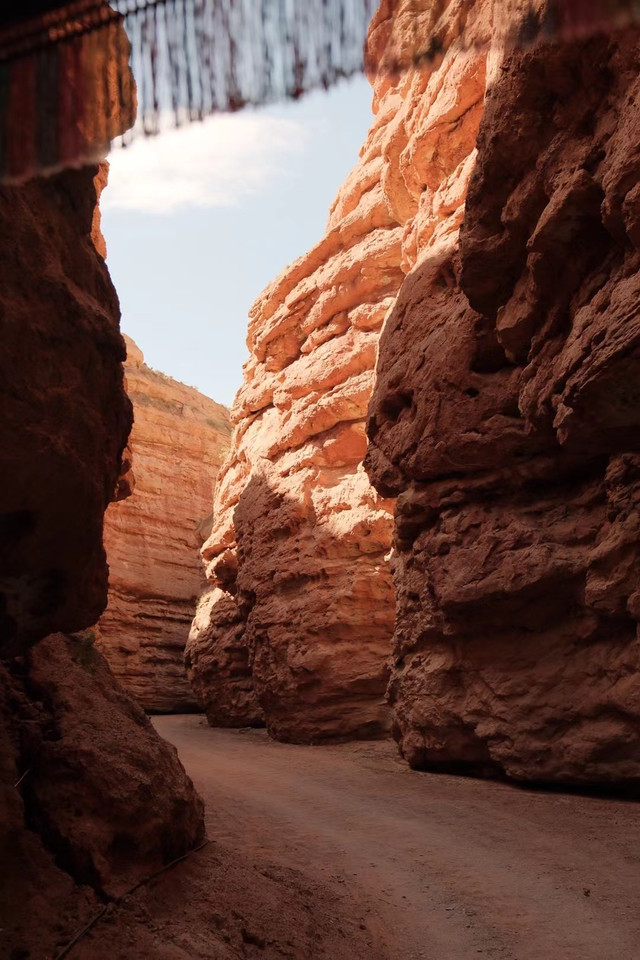 坐在骆驼车上经过的这段路程是最幽深最最漂亮的,骆驼身上的铃铛发出清脆的声响,此情此景让人有穿越时空的感觉。被阳光映照的山体很美,阴阳面形成了不同的色彩使得峡谷更有立体感。