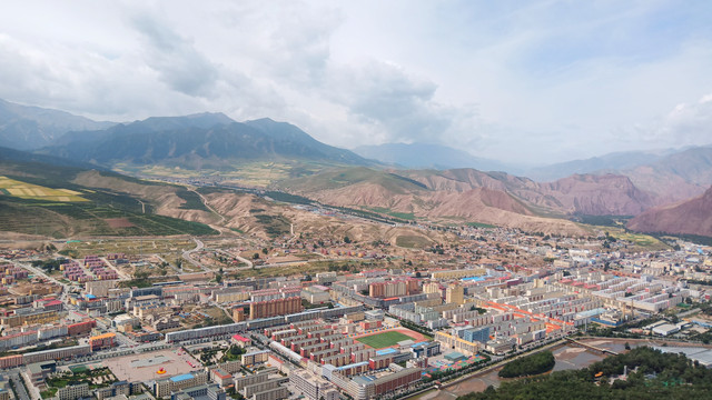 山脚下八宝河像一条白色的哈达环绕在县城周边。