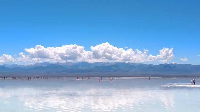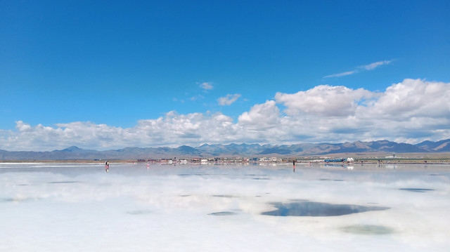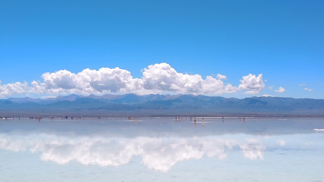 每年6月至10月,由于茶卡盐湖大量的湖盐类沉积矿物结晶析出,湖底便形成了数十米厚的盐地。盐地之上的水只有几毫米深。远远望去,站在盐地上的人好似漂浮在水面上一般,倒影清晰可见。由此得名“天空之镜”。