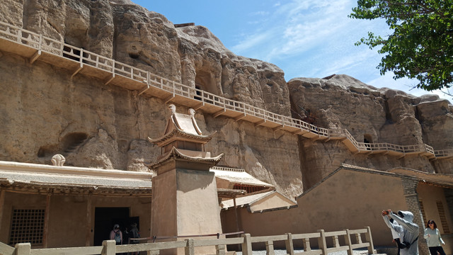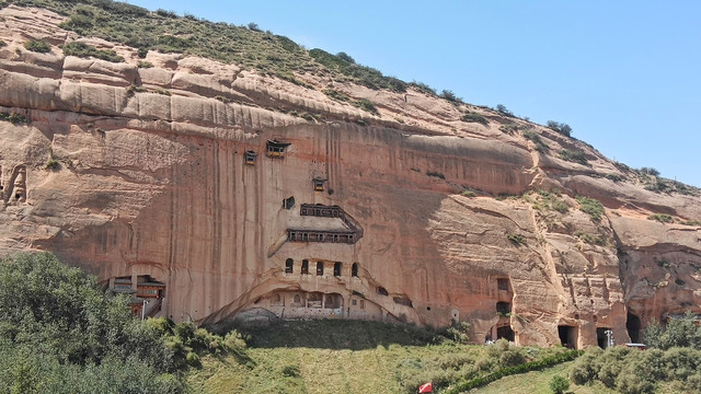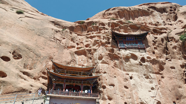 三十三石窟,上下有七层共21个石窟,整齐排列在百米多高的悬崖上,每层之间都有隧道相通。隧道开凿在岩壁内部呈“之”字形。石阶层层,回廊曲折,最窄处仅能容一人通过。