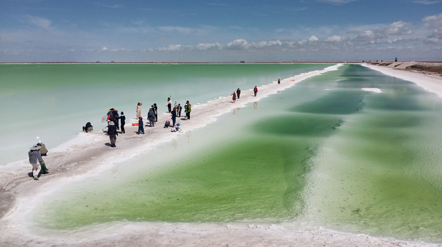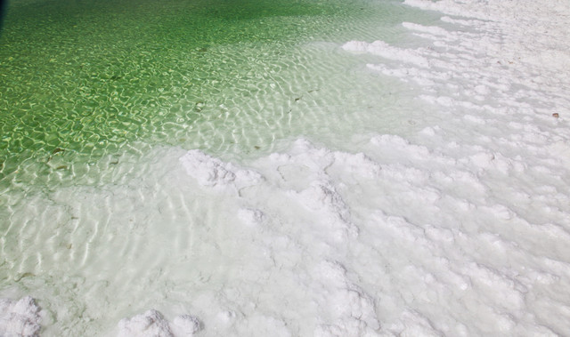 翡翠湖由大小不等、形态迥异、深浅不一的盐池组成。湖内富含不同浓度的钾、镁、锂等多种元素,所以呈现出不同的颜色,每一片水域的颜色不仅和矿物质浓度有关,还和天气、时间段有关。