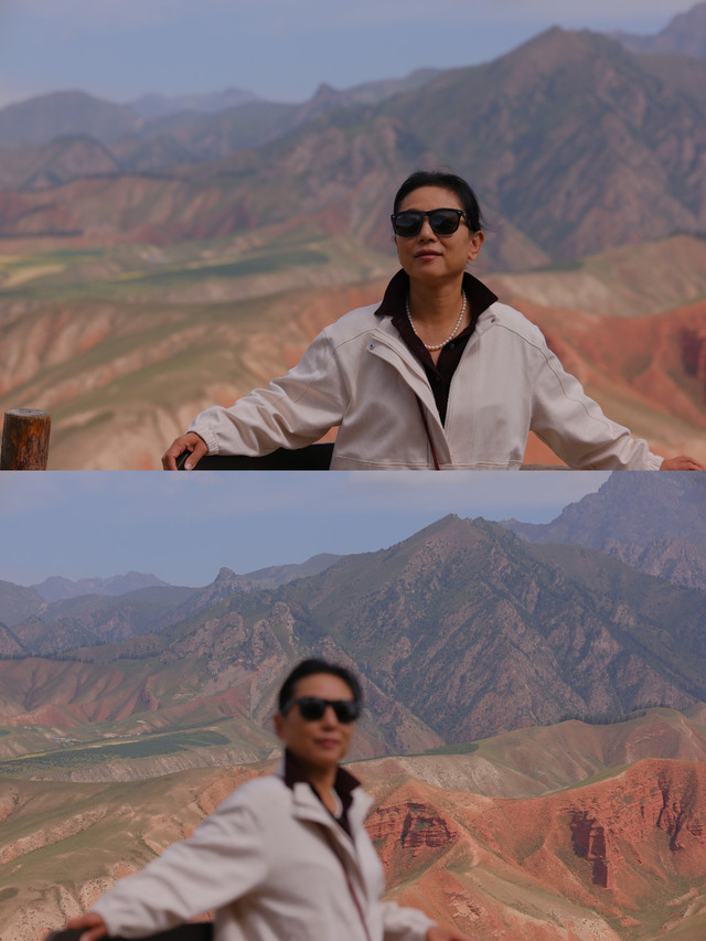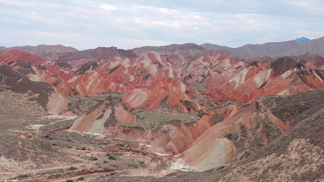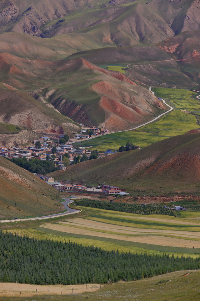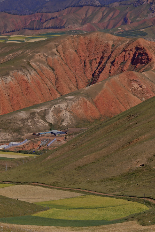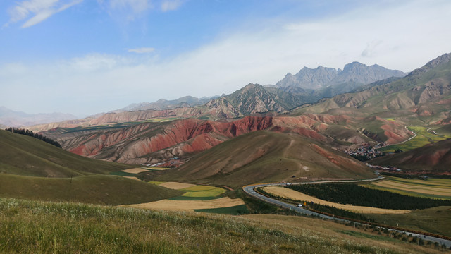 从青甘一路走来,辽阔无边,风沙干旱,色彩单一,黄色为主。直到进入张掖市,绿色植被开始多起来了,有水就有绿植,环境有所改观。这一片色彩也丰富一些。