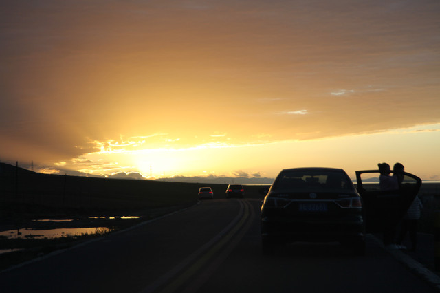 青海湖边的落日晚霞,余辉照亮了天空。