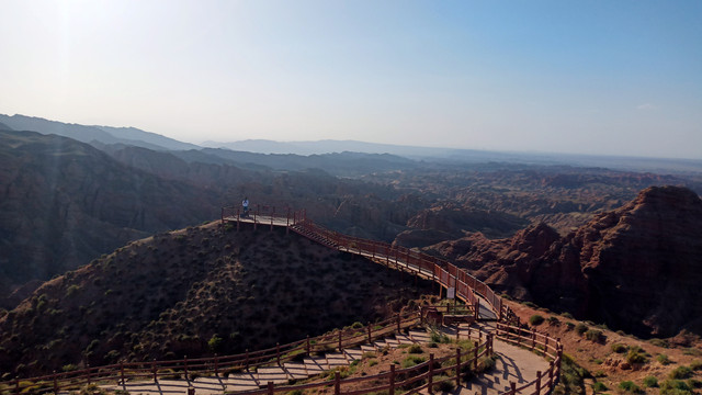 D11(8/20)今天去看看平山湖大峡谷,走的是大环线深度游,景交车17公里,先上观景台,在山顶瞭望丹霞地貌,然后搭乘越野车颠簸在山腰之间,非常陡峭,游走在悬崖峭壁之间直至谷底,之后行走300米,骑骆驼200米,步行,乘骆驼车,再步行1.4公里,到旋转楼梯上380级台阶,来到4号观景台,乘景交车返回起点。