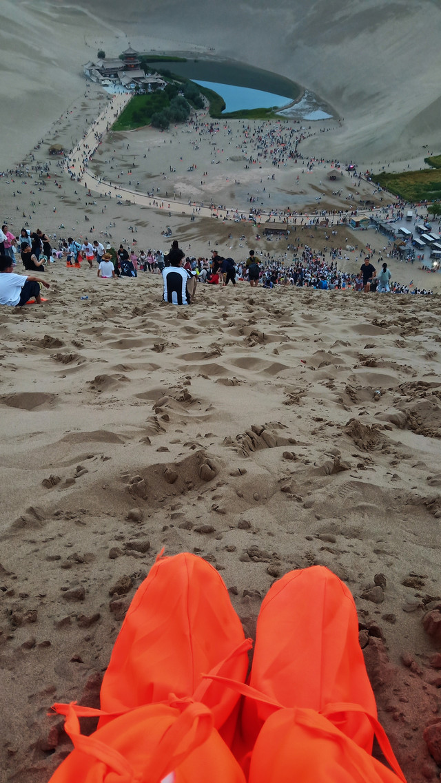 胶鞋可以自己带,也有租用,费用20元。排队走梯子上沙山用了一个多小时,也没有到顶,最后三分之一没有梯子太难走了,走一步退两步。