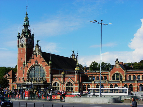 后来普鲁士王国兴盛起来,1793年俄普奥第二次瓜分波兰,格但斯克划归普鲁士,使用德文名字但泽。这个德意志时期的建筑,最漂亮的是火车站,直到今天仍在使用。它是十九世纪浪漫主义时期的建筑,红砖房子在蓝天映衬下古雅而大方,这座车站的设计,被原样照抄到法国阿尔萨斯地区的科尔玛城(Colmar),所以在科尔玛,你能看到一模一样的火车站。