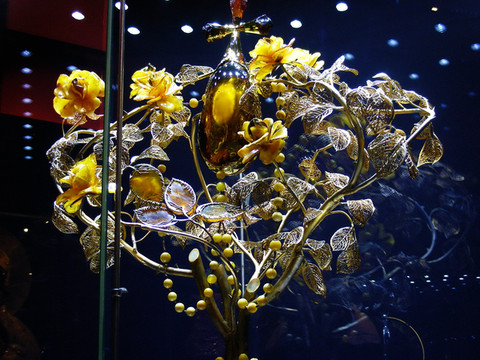 琥珀镶纯金并不好看,因为都是黄色的,没有颜色对比。波兰工匠擅长用琥珀镶银做首饰,据说这种手法是波兰特有的工艺。如果要看真正大件的琥珀工艺品,那么应该去城西的圣布里吉特教堂(St. Bridget Church),那里的圣坛用巨型整块琥珀制作,圣坛12米高,6米宽,3米厚,圣母子像、两侧侍立的圣徒,和波兰之鹰完全由琥珀雕成。