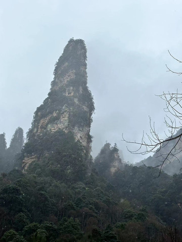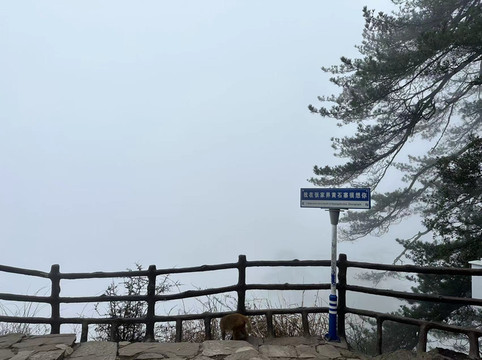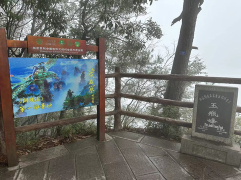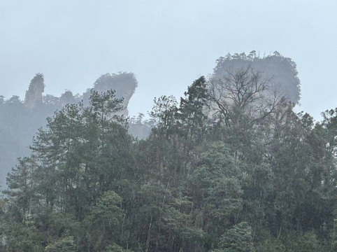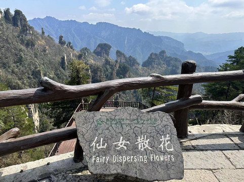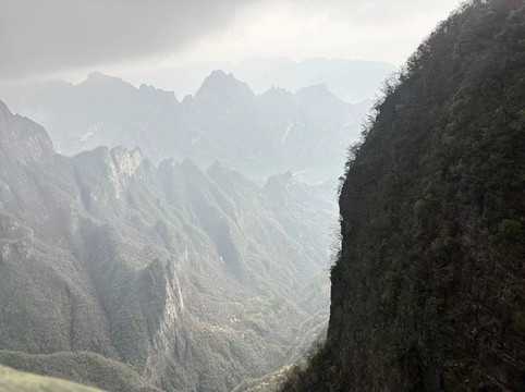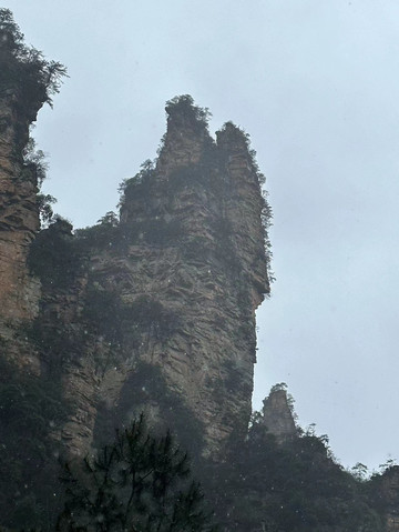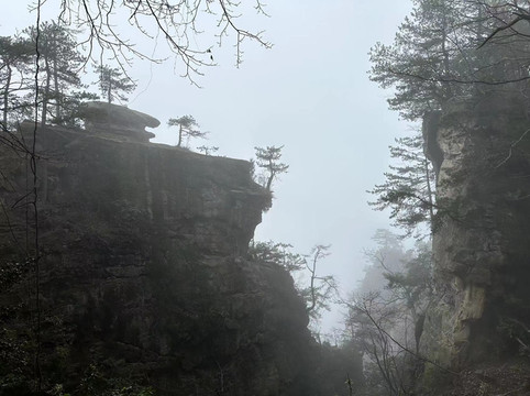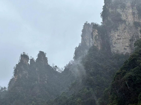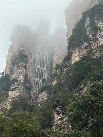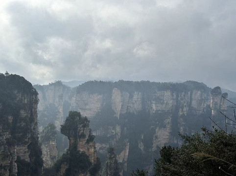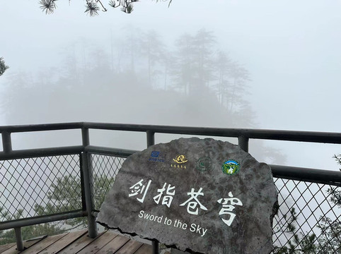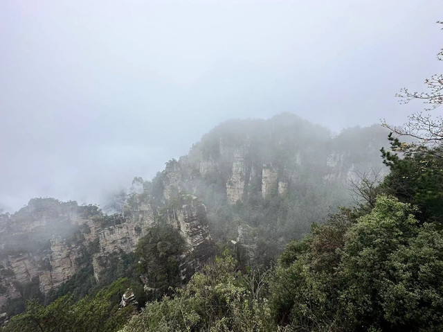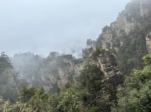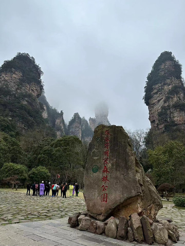 由于坐环保车的时候听同车人员说百龙天梯排长队,所以立即决定前往天子山索道上山走一遍反向的游览路线熟悉路况,果不其然,天子山索道乘坐到一半的时候仿佛进入天宫,车厢外白茫茫一片什么都看不到,下了索道,乘坐环保车五分钟到达天子山核心景区,贺龙公园里面有贺龙元帅的铜像,但是大雾天气几乎什么都看不到,所以就只是快速走了一圈天子山的景点,天子山的景点是以贺龙公园为起始点,往两个方向呈放射状游览,也就是天子山游览景点都是需要走回头路,体力不好的朋友可以根据自身实际情况决定景点的取舍。走一圈之后跟着标识前往停车场坐景区环保小巴车前往杨家界停车场,到了杨家界的时候雾稍微散开了,并且遇上一个刚刚上山来的老奶奶,卖小零食5元两袋10元四袋,买了四袋老奶奶的零食,老奶奶说这会儿雾散了可以看到天然长城了,给我指了指方向,由于本就不打算带着父母走杨家界这段往返的路段所以碰巧雾散了,就直接走过去看天然长城了,