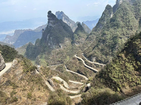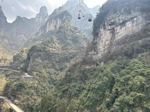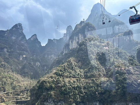 由于早上入园比较早,大索道也基本没排队,到了就直接上,索道最多八人一个车厢,全程28分钟,从市区直接送至天门山山顶,途中可以看到张家界火车站汽车站然后欣赏田园风格,还可以俯视天门山99道弯盘山公路,同时天气好在索道过程中就可以看到天门洞哦。