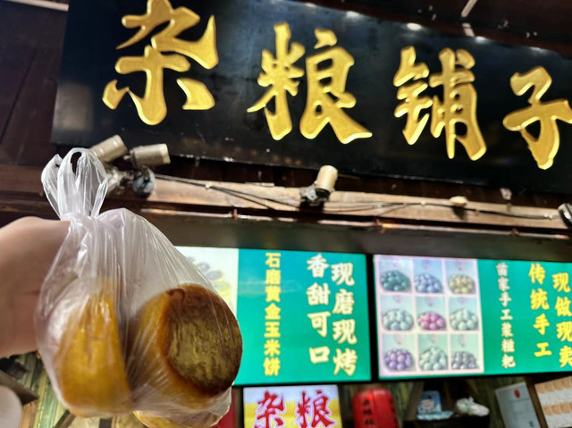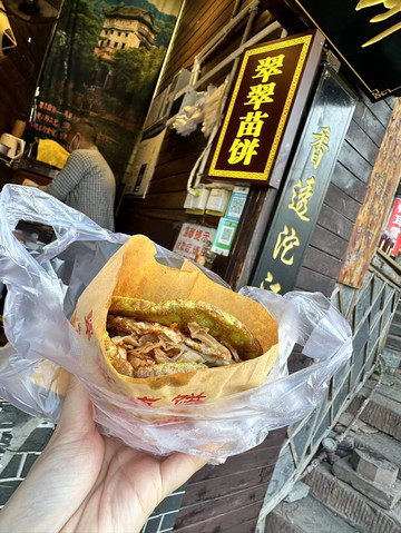 和老板对暗号赠送了一个糍粑嘿嘿,苗饼就是在磨出来的坯子里面加上豆皮咸菜,翠翠野菜苗饼里面有鸡蛋,
