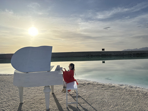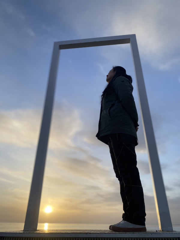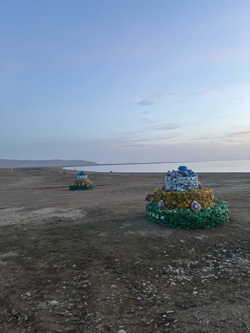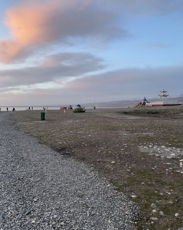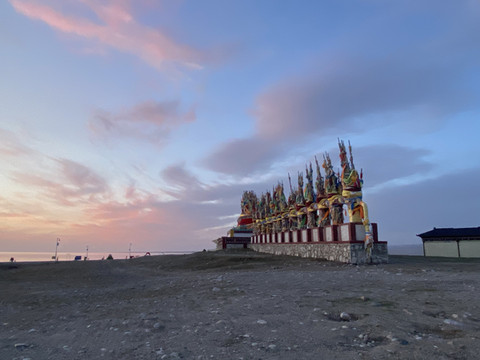 青海湖着实很漂亮,天有点微亮,湖水被风吹到岸边,略有呼啦呼啦的声音,远处有些鸟像是海鸥,看到我们,就飞过来离得近了些,湖水蓝色的,而背后就是一大片的雪山连着(不知道是不是阿玛尼卿山脉),当地管委会看得出来还是花了些心思的,安置了些文青拍照的摆设,还有个大点的经幡和白塔,关键是这个地方景点还放着轻音乐,氛围一下子就起来了。