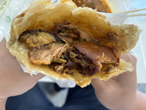 第一站,塔尔寺。曹家堡机场离西宁市区不远,路况好的情况下,30~40分钟能到,而西宁市离塔尔寺也很近,从市区过去也就30多分钟能到。12:30开车抵达塔尔寺停车场,下车休整一下,不找附近的餐馆了,就在车上把金拱门和飞机餐当午餐吃了,胡乱对付几口,消除饥饿感就行,金拱门凉了是真不好吃,解决完中饭发现飞机餐还剩两盒没吃完。下车往景区走,要过一条人为用栏杆围起来的小路,这里有好几个卖特产和旅游商品的小摊,摊贩老板见了我们一家人会叫卖一下,但是我们也只是看几眼并不会问价、问货。
