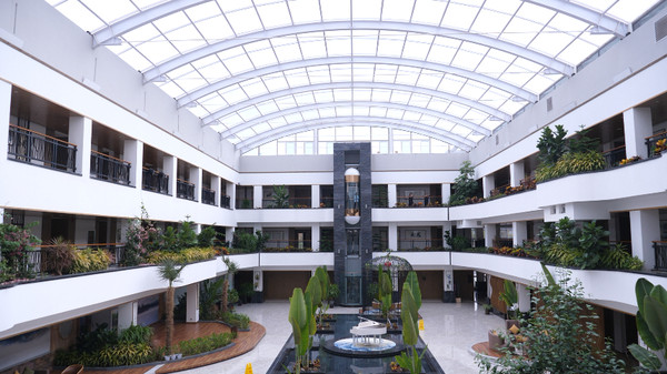 连廊、瀑布墙、简约而不简单的豪装、齐全的配套设施,再加上放眼望去酒店内部一片生机盎然,甚至还种植了三亚市花三角梅。